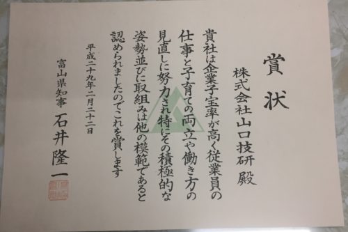 当社は、平成28年度富山県子宝モデル企業として富山県から表彰をうけました。 富山県が行った企業子宝率調査において、従業員10人~50人の規模にて子宝率が高く職場環境づくりを積極的に進めている企業として選定さ […]